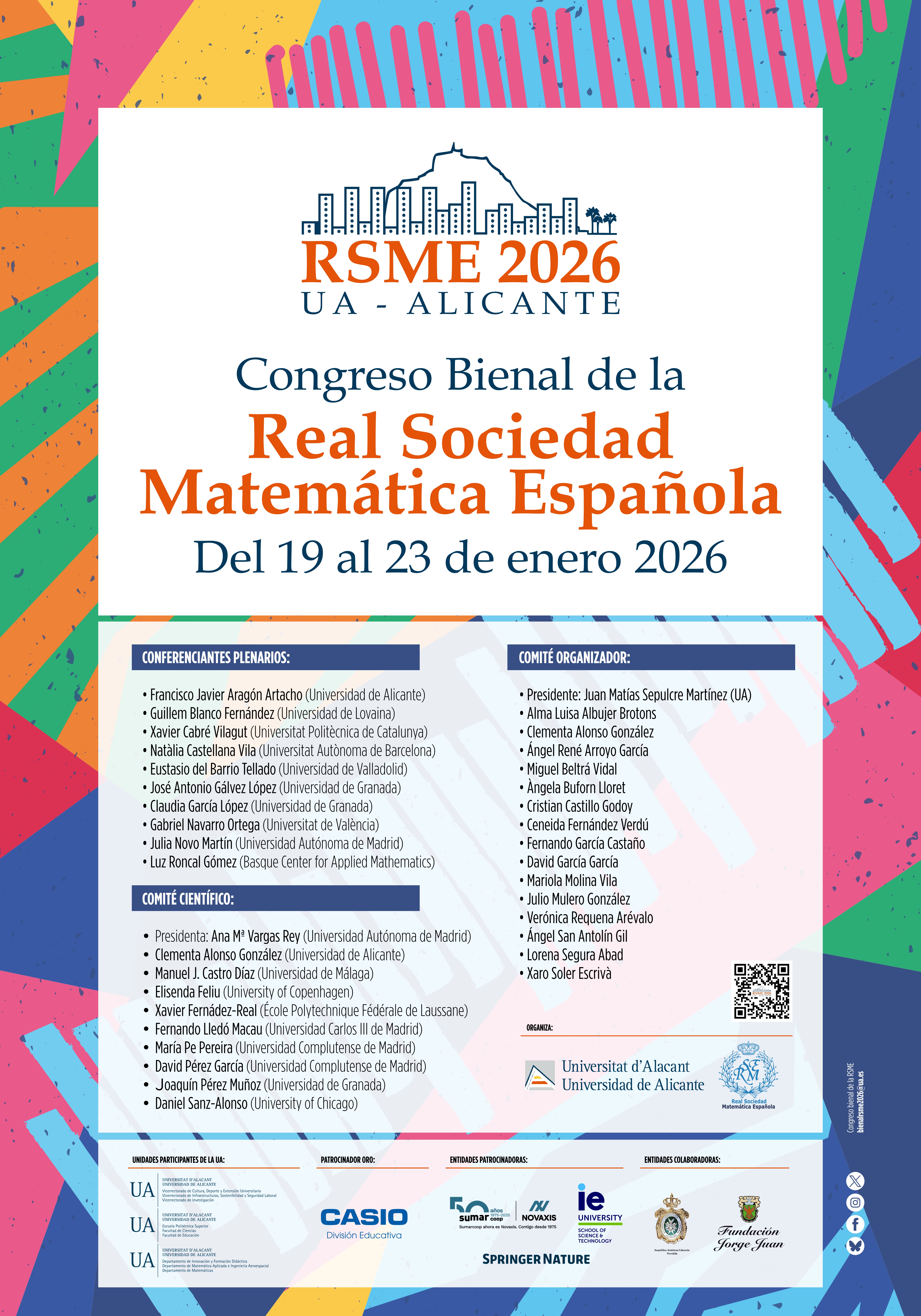 El Comité Organizador del Congreso Bienal de la Real Sociedad Matemática Española 2026 os invita a participar en dicho encuentro que se celebrará en el campus de la Universidad de Alicante (UA) del 19 al 23 de enero de 2026. Es la primera vez que la provincia de Alicante y la Comunidad Valenciana acoge este importante evento.
